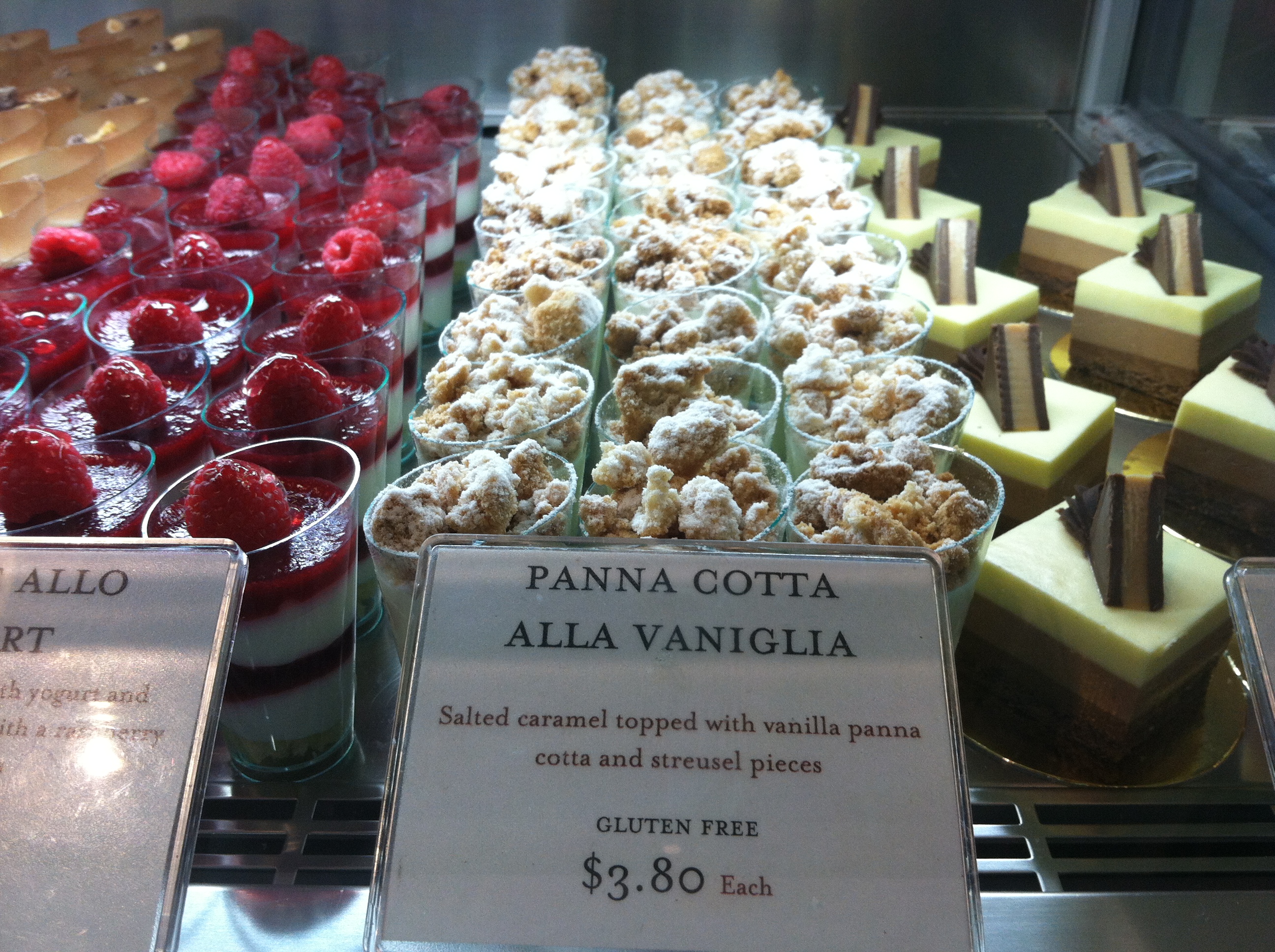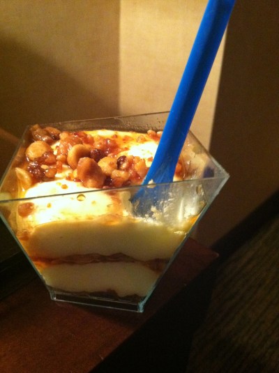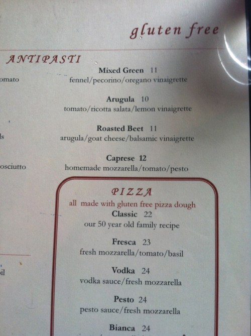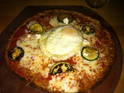 I got the farmer’s egg pizza with zucchini and ricotta. The thin crust and wood-grilled crispness made this pizza something special. My friend tried a slice and said that she really couldn’t tell the difference between the gluten free crust and the regular one. Next time I’ll make sure to stay for the Lemon-Raspberry Parfait– (gluten free sponge cake, layered with lemon curd, raspberries and rum marscapone mousse). Mmm.