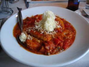 I had wanted to try grouper, since it’s a specialty of the region – so I got the grouper and Gulf shrimp in tomato and caper sauce, with garlic risotto. Mmm….